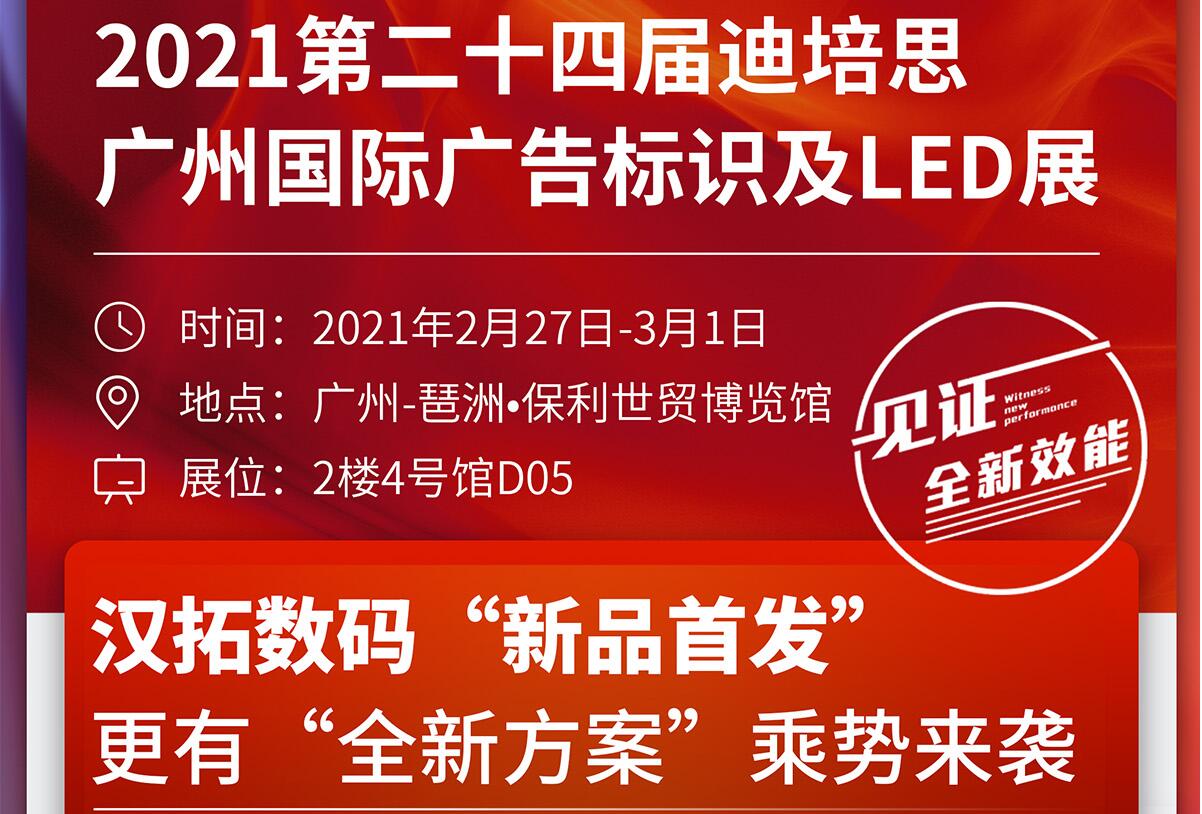 另外,漢拓新春首場(chǎng)-2021廣州迪培思國(guó)際廣告標(biāo)識(shí)及LED展將于明日(227日)在廣州琶洲保利世貿(mào)博覽館隆重舉行,漢拓展位在24號(hào)館D05,此次漢拓?cái)?shù)碼將攜最新UV打印機(jī)產(chǎn)品參展,讓您見(jiàn)證全新工業(yè)化效能,期待各位新老朋友蒞臨參觀指導(dǎo)。