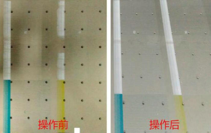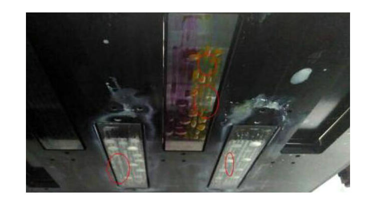 1. 壓墨發(fā)現(xiàn)局部噴嘴墨水很難出來。如下圖,紅色圈起來的地方,壓墨時墨水難出來,而其它地方良好。這是噴嘴表面干燥造成的??梢杂眠厜耗叢羾娮斓姆椒?,用壓出的墨水濕潤堵塞的孔。在操作過程中,需要注意必須使用細軟的無塵布,視噴頭表面干燥情況可適當(dāng)沾上清洗液擦拭,不要直接用干布擦拭,避免損壞UV打印機的噴頭。
