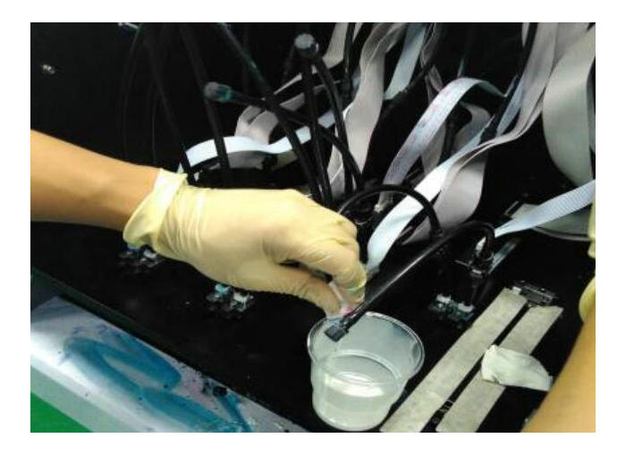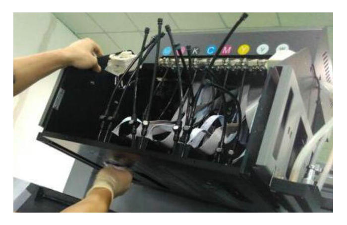 3. 彩墨或者白墨打狀態(tài)部分孔發(fā)虛。確認溫度電壓波形正確后,可使用高壓的方法。但前提是執(zhí)行了上述兩個步驟仍沒有效果,才可以使用高壓的辦法。關(guān)閉清噴,不需要降低負壓。以強壓淺紅為例,如下圖,把UV打印機所有墨閥關(guān)閉,右手拿墨閥按上需要強壓墨的噴頭上,隨時準(zhǔn)備開閥,左手按壓墨按鈕5秒,然后右手開墨閥 1 秒,再左手松開壓墨。最后擦干凈噴頭,打狀態(tài)條查看。