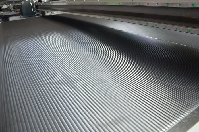 UV網(wǎng)帶機(jī)的核心工作原理,其實(shí)跟UV平板打印機(jī)是一樣的,也都是通過噴墨控制和UV光固化來實(shí)現(xiàn)圖文打印。不同的是,UV網(wǎng)帶機(jī)的Y向運(yùn)動(dòng)是由網(wǎng)帶平臺(tái)吸附打印介質(zhì)移動(dòng)完成的,打印小車只負(fù)責(zé)X軸方向的運(yùn)動(dòng)。而UV平板打印機(jī)則是由打印小車同時(shí)完成X向和Y向的運(yùn)動(dòng)。