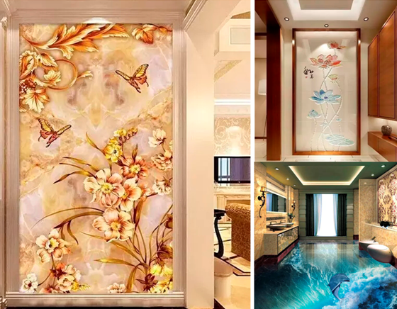 隨著UV數(shù)碼打印技術(shù)的不斷成熟和人們對(duì)家庭裝飾裝修要求的不斷提高,個(gè)性化定制越來(lái)越普遍,即客戶依房型、材料、尺寸請(qǐng)專業(yè)的設(shè)計(jì)師按個(gè)人喜好量身定做,然后安排生產(chǎn)、安裝。包括墻紙、壁畫、裝飾畫、玄關(guān)、吊頂、瓷磚背景墻、木紋拼花、紡真木紋地板、三聚氰胺移門、彩繪藝術(shù)玻璃等。